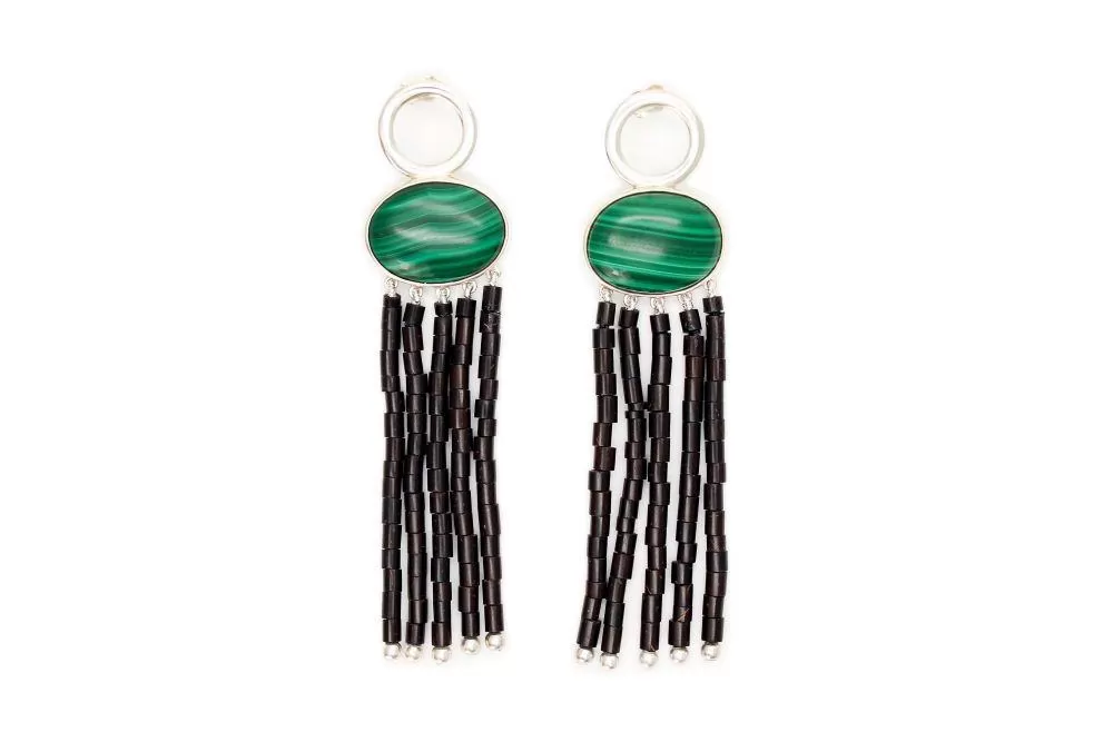 Coleção Amazônia, Brincos em Prata 925. Pedra Malaquita e semente de tucumã, peso 8,13g comprimento 8,7 cm largura 2,0cm altura 0,5cm